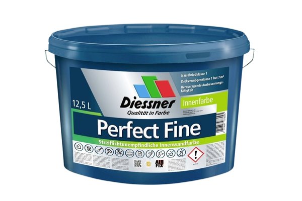 Diessner Perfect Fine ist eine hochwertige Dispersionsfarbe für Wand- und Deckenflächen im Innenbereich. Sie überzeugt durch hohe Deckkraft, lange Offenzeit und eine streifenfreie, homogene Oberfläche – ideal für große Flächen mit schwierigem Streiflichteinfall. Die Farbe ist stumpfmatt, leicht zu verarbeiten und optimal ausbesserbar. Emissionsminimiert (ELF), geruchsarm und beständig gegen wässrige Desinfektionsmittel.